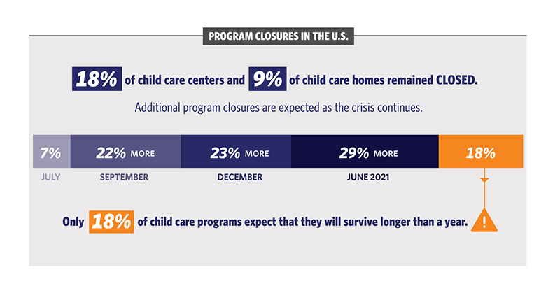 “The unplanned disenrollment of children, sustained closures, and lack of essential materials may lead to the biggest child care crisis in modern history,” the policy brief stated. “Various data sources suggest that between one-third and two-thirds of centers remained closed at the beginning of July 2020, and a survey of providers revealed many programs would not be able to remain open or reopen without financial assistance.”
