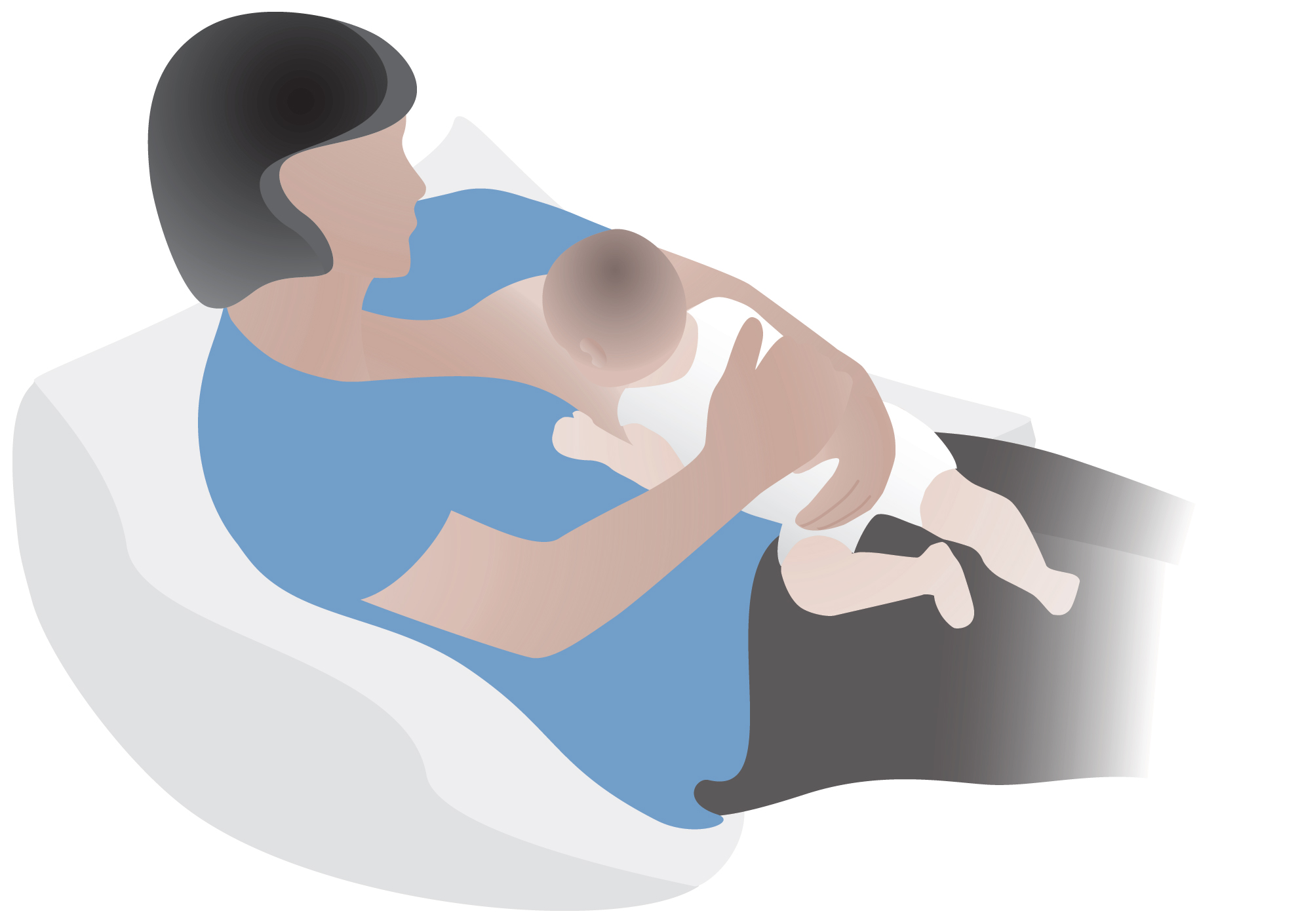 Ponga a su bebé atravesado sobre su estómago con la cabeza en el pliegue del codo. La barriga de su bebé está frente a la suya. También puede sostener a su bebé con el otro brazo.
