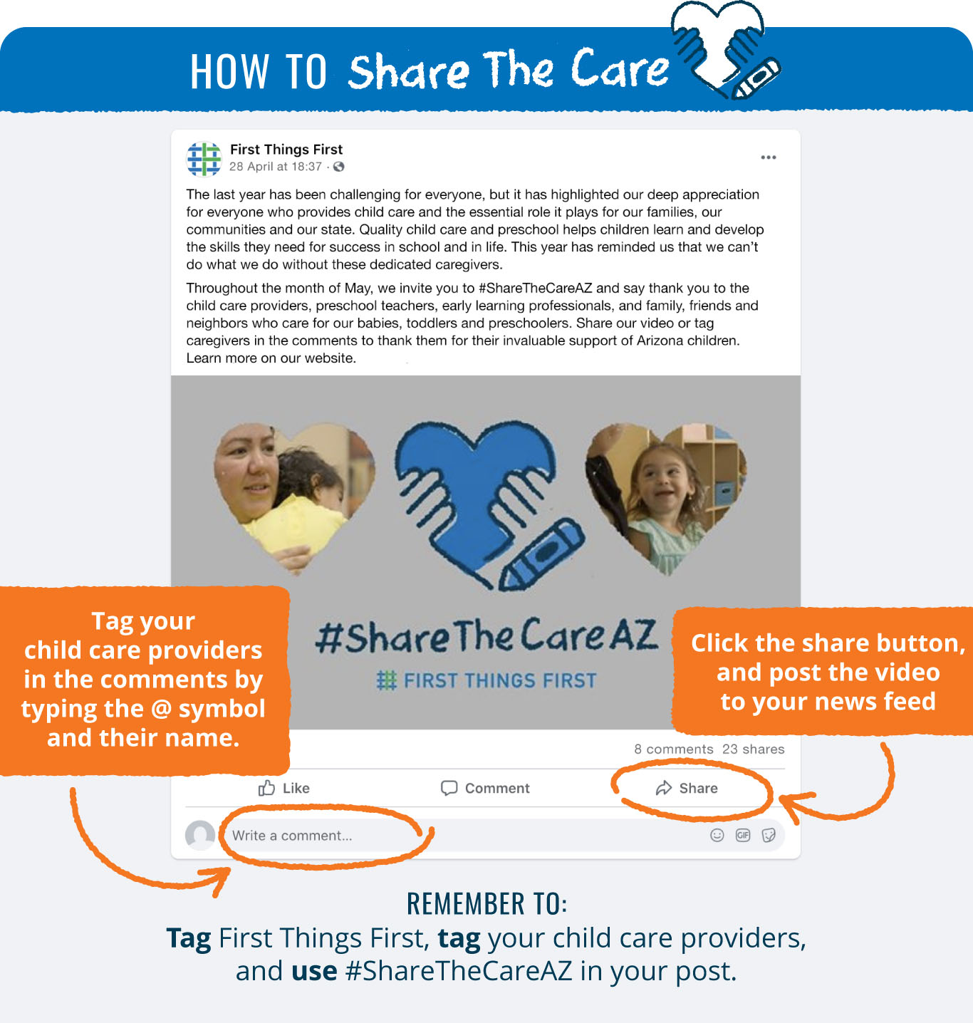 The best way to help share the care is to do just that — share. Share the video above on your social platforms and tag your favorite provider or center with a personal note — just be sure to use #ShareTheCareAZ and tag First Things First when posting. You can also copy this video link: youtu.be/v7scZvSetko.)
